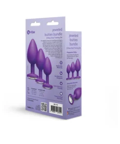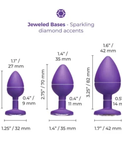 This purple anal plug set includes 3 sizes ranging from 2.75″ to 3.75″, each made with body safe silicone, tapered tip, and a flared jewel base. Water-based lubes are recommended.