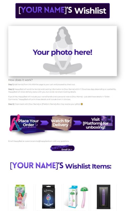 If you’re a beginner or aspiring cam model, adult entertainer, or content creator, HappyBed can customize and maintain a landing page for your adult toy wishlist. HappyBed stands in as a trusted third-party and facilitates audience-funded gift delivery. This makes gifting a playful and fun way to safely interact and connect with your fans while maintaining personal privacy. Share the link to your wishlist during your cam sessions or in your media and let your audience purchase and send items to you discreetly without sharing your personal information.
