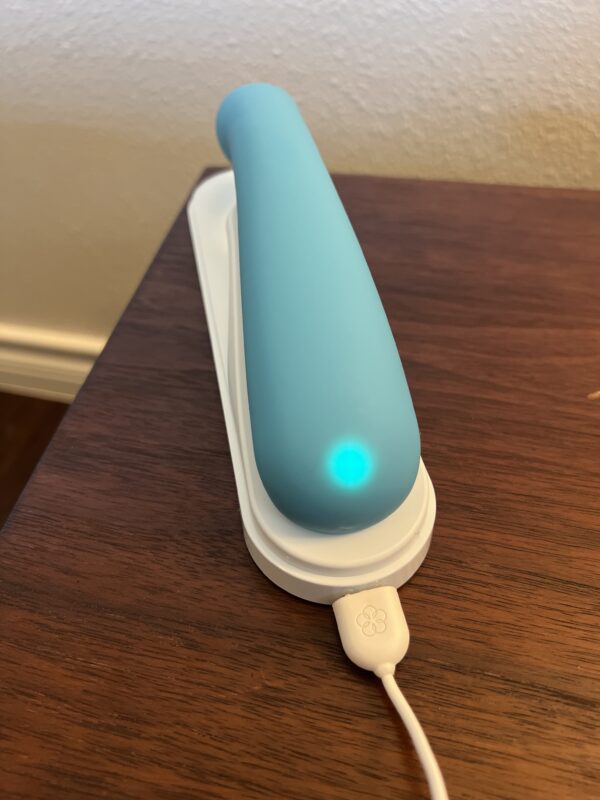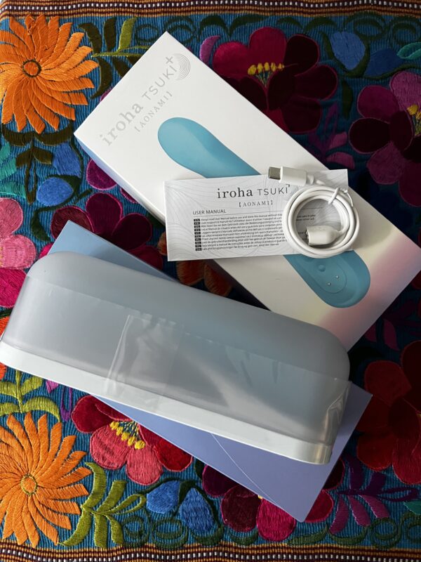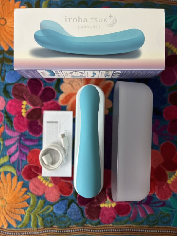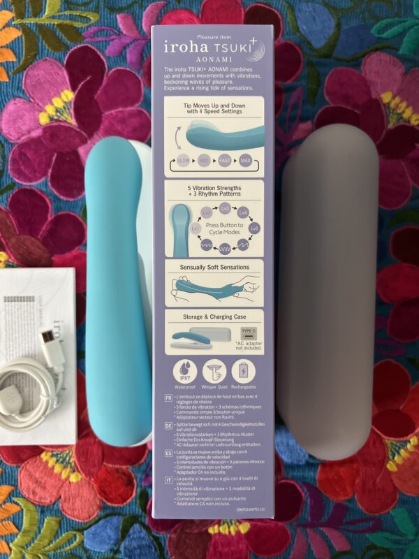 Everything about Iroha’s packaging feels high-end; the toys in the line make a great gift. Iroha’s Tsuki+ Aonami comes with a charging stand with a frosted, semi-transparent cover to protect the toy while charging or in storage. Its magnetic charging cable is a proprietary Iroha cable with a small flower emblem printed on it for identification.
