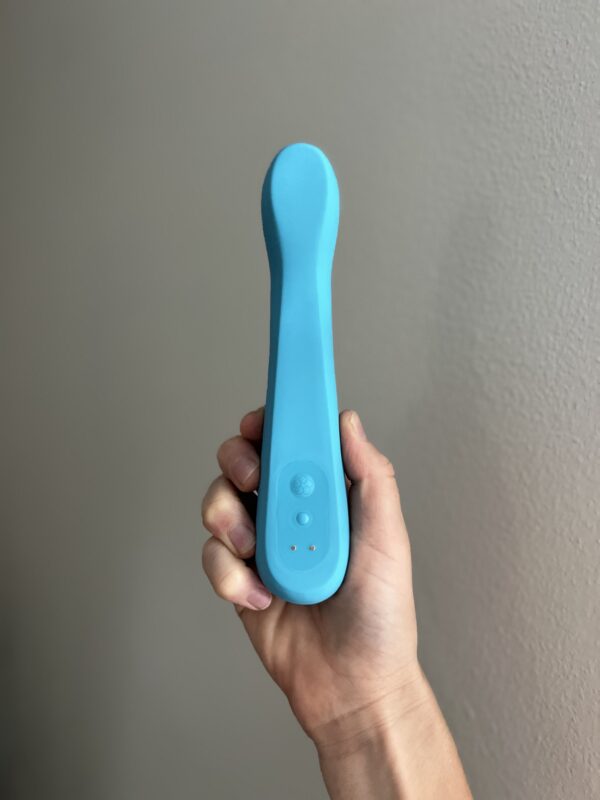 Compared to similar toys I have on hand, the great thing about Aonami is that I can enjoy it for both internal and external stimulation! Its tip is flat on the side of its inner curve, but the silicone has a fleshy give to it, which feels wonderfully soft and intimate on the vulva and clit. The shaft isn’t flexible, so you can apply pressure with it (to be safe, you should probably do this with the tip flicking/massaging turned off).