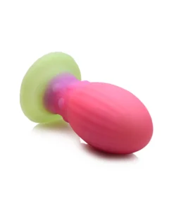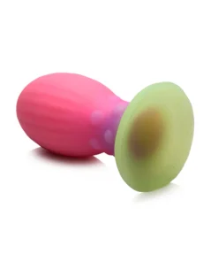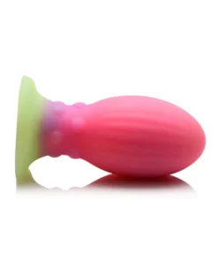 This alien-esque Xeno Egg plug measures 5.25″ long (4.5″ insertable) and 2.3″ wide. The Xeno egg has ribbed sides and small bumps around its neck. Its glittery pink, purple and green bands of color terminate in a flared base for body safe use.