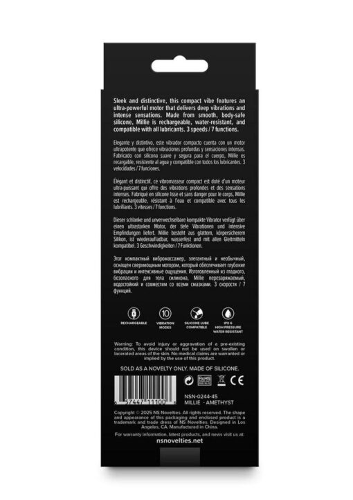 This distinctive, compact vibe features an ultra-powerful motor that delivers deep vibrations and intense sensations. Its short insertable shaft has a rounded, bulbous tip for shallow penetration. Made from smooth, body-safe silicone, the Millie vibrator is rechargeable, water-resistant, and compatible with all lubricants.