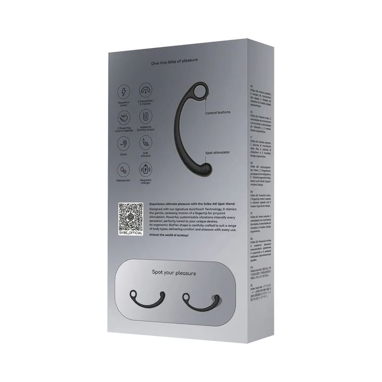 SVibe’s AXI Spot Wand is designed to mimic a rhythmic fingering motion for g-spot or prostate stimulation. AXI’s curved shaft acts as a natural lever so that you can apply pressure precisely where needed. Its rounded stimulator tip intensifies the experience with 5 intensities and 3 modes, plus 2 fingering motion speeds.