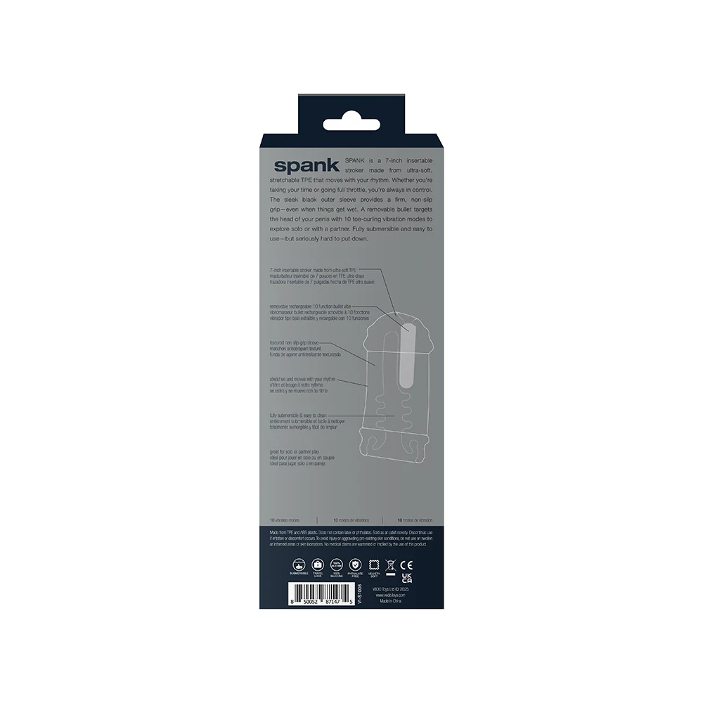 The VeDO Spank is a vibrating stroker with 7″ depth, silky smooth TPE sleeve, and textured outer sleeve for a good grip. It’s powered by a removeable bullet vibrator positioned at the head of your penis, delivering 10 vibration modes. The VeDO Spank is fully submersible/waterproof, making it easy to enjoy and clean.